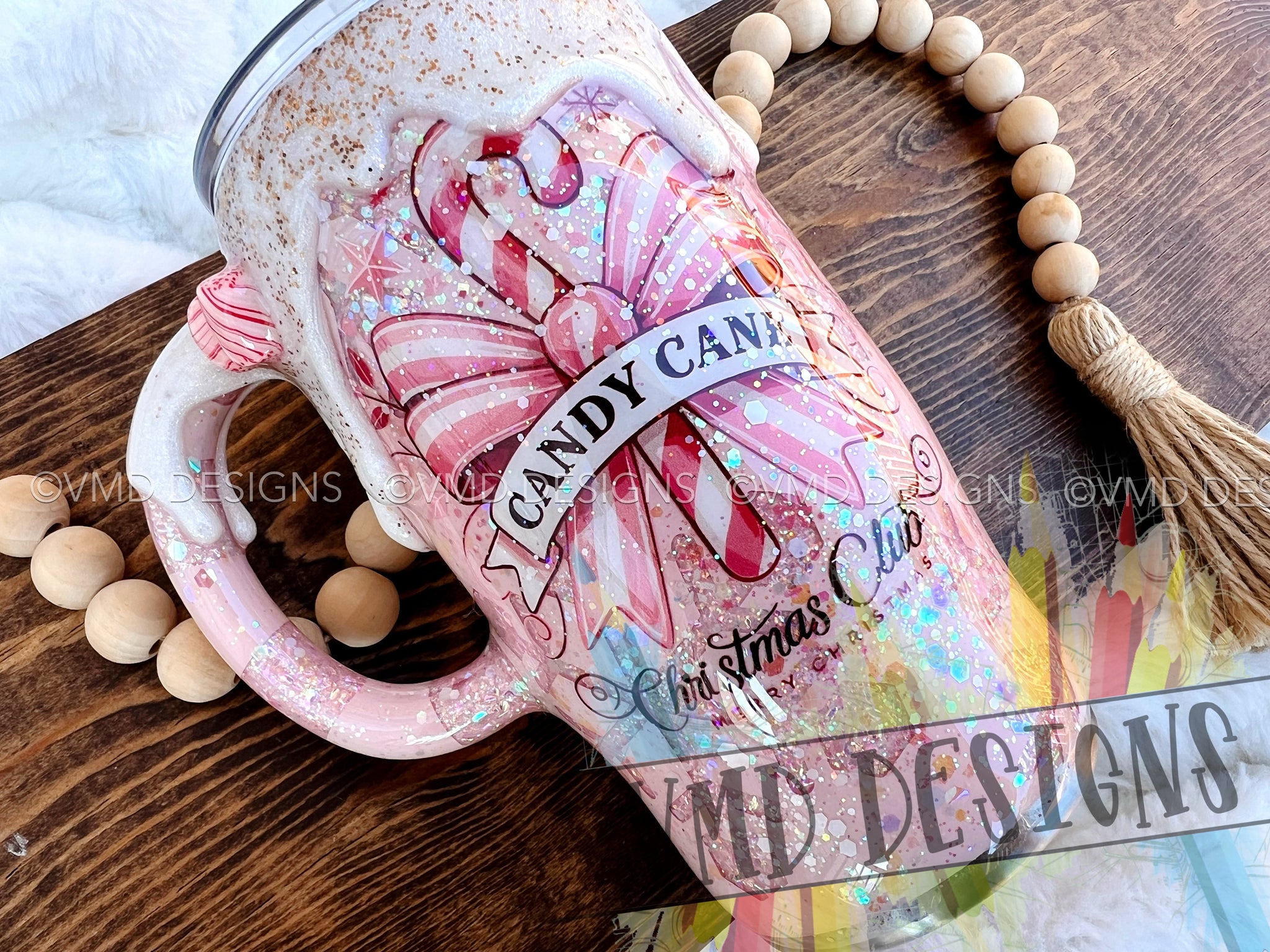 Pink Christmas themed with striped handle, this 16oz travel mug is perfect for your hot drinks while you go to look at Christmas lights. If you celebrate the holiday season all year round (like me) this makes a super cute every day mug for your hot beverages.