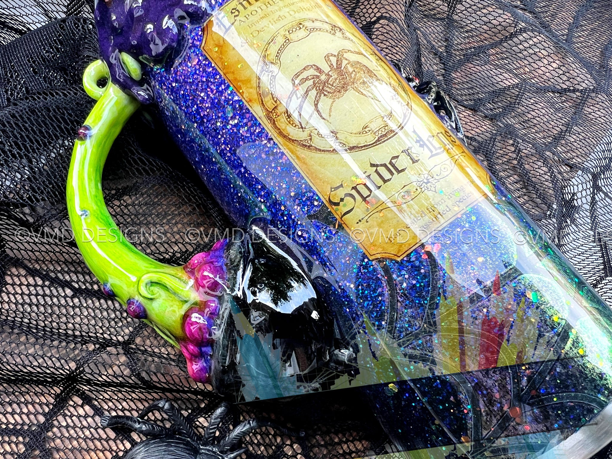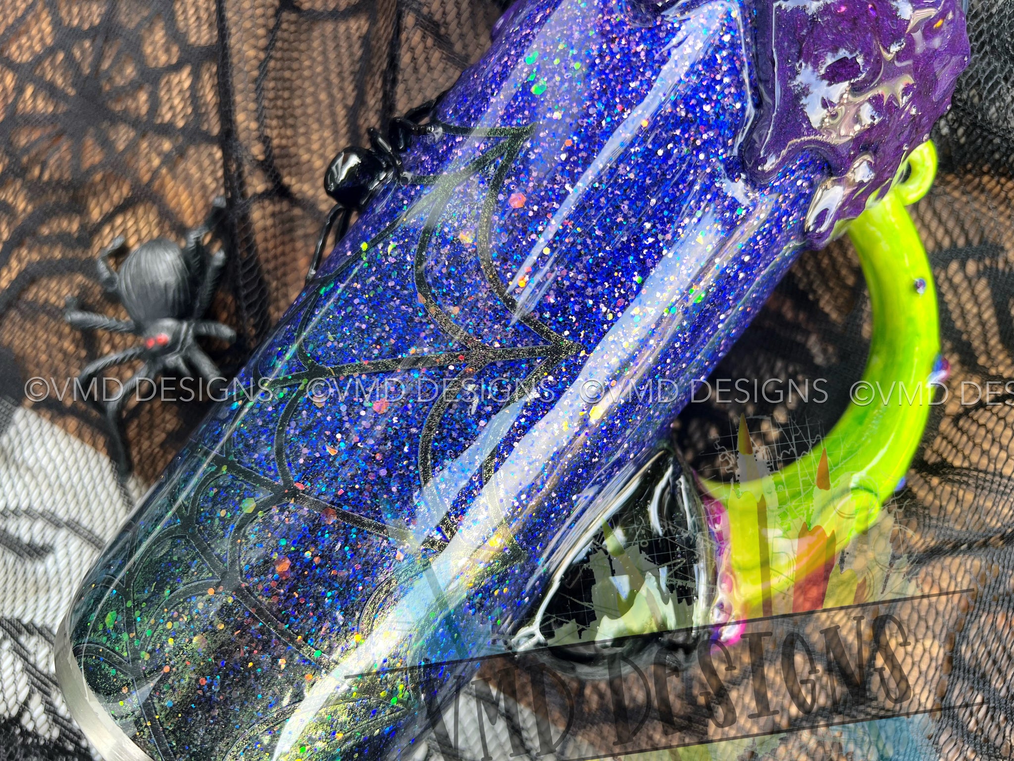 This design is perfect for spooky season and made with polyester glitters for the ultimate sparkle. A super bubbly drip with an eight legged friend accent this spooky design.